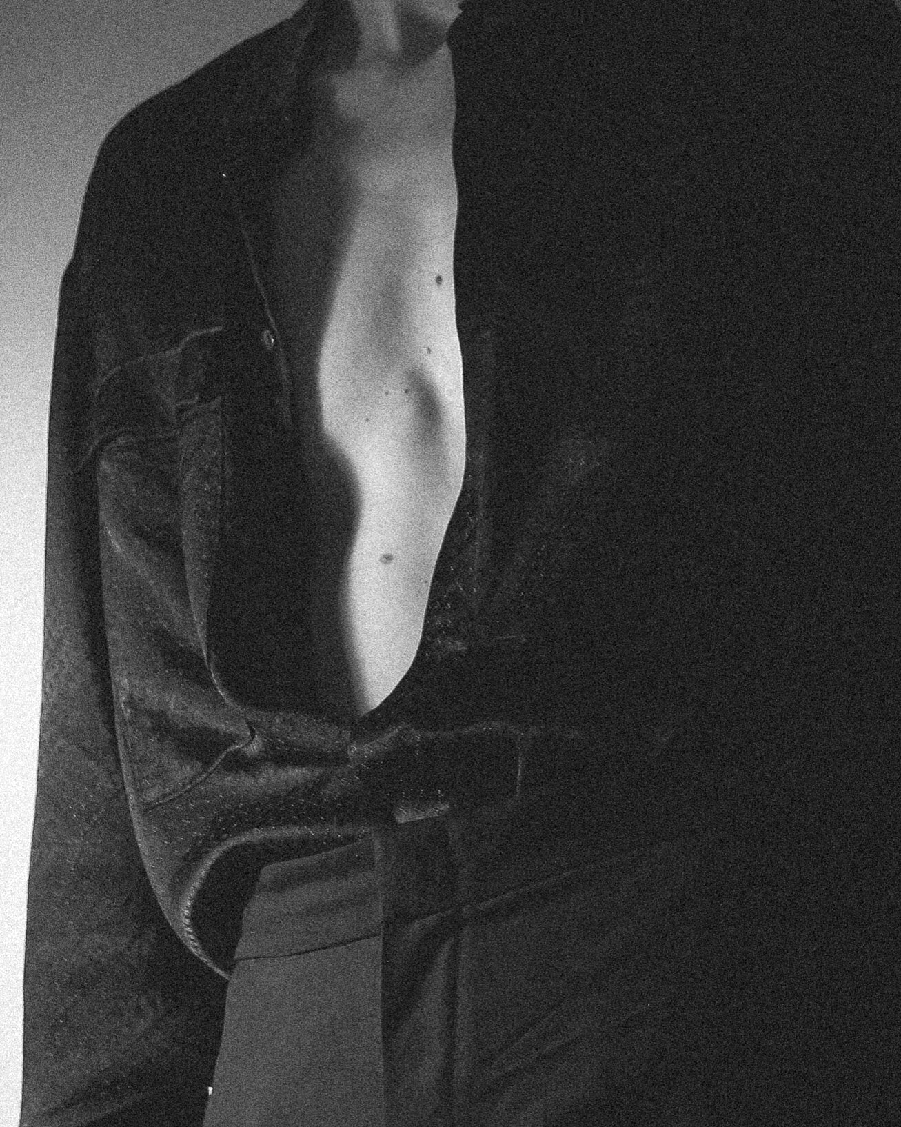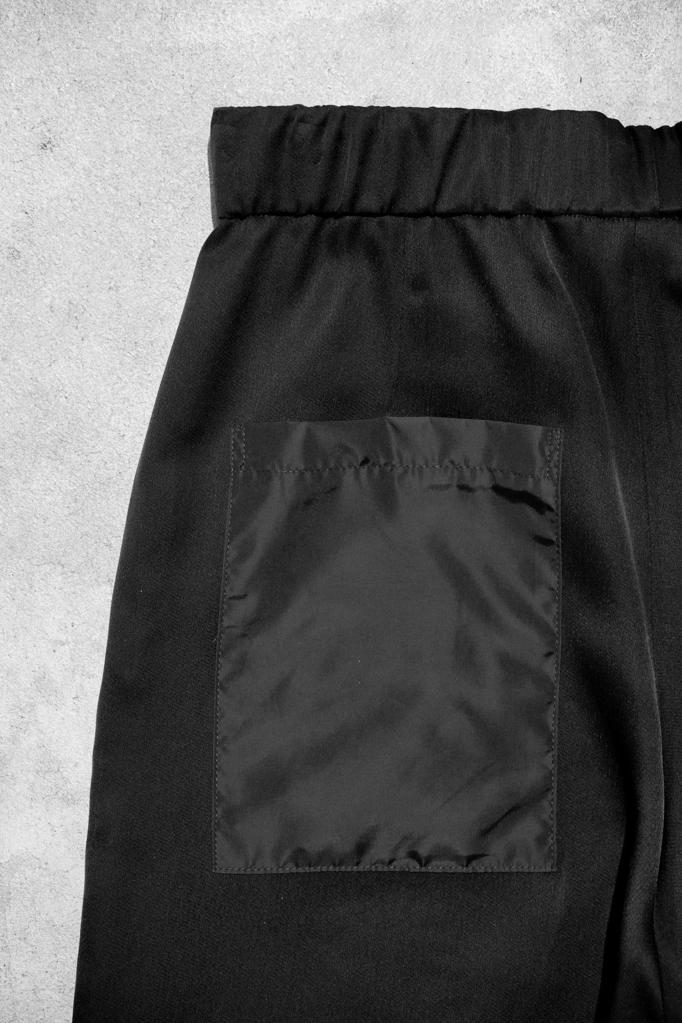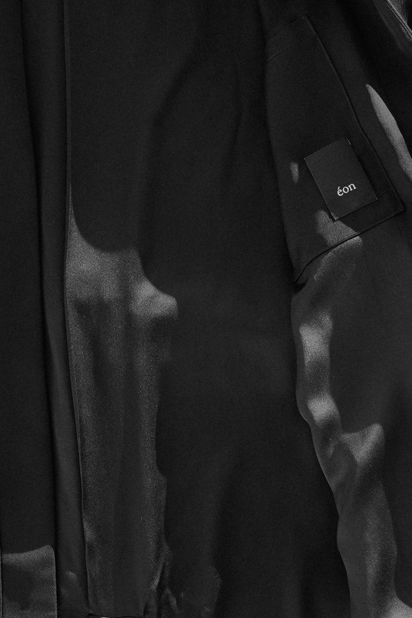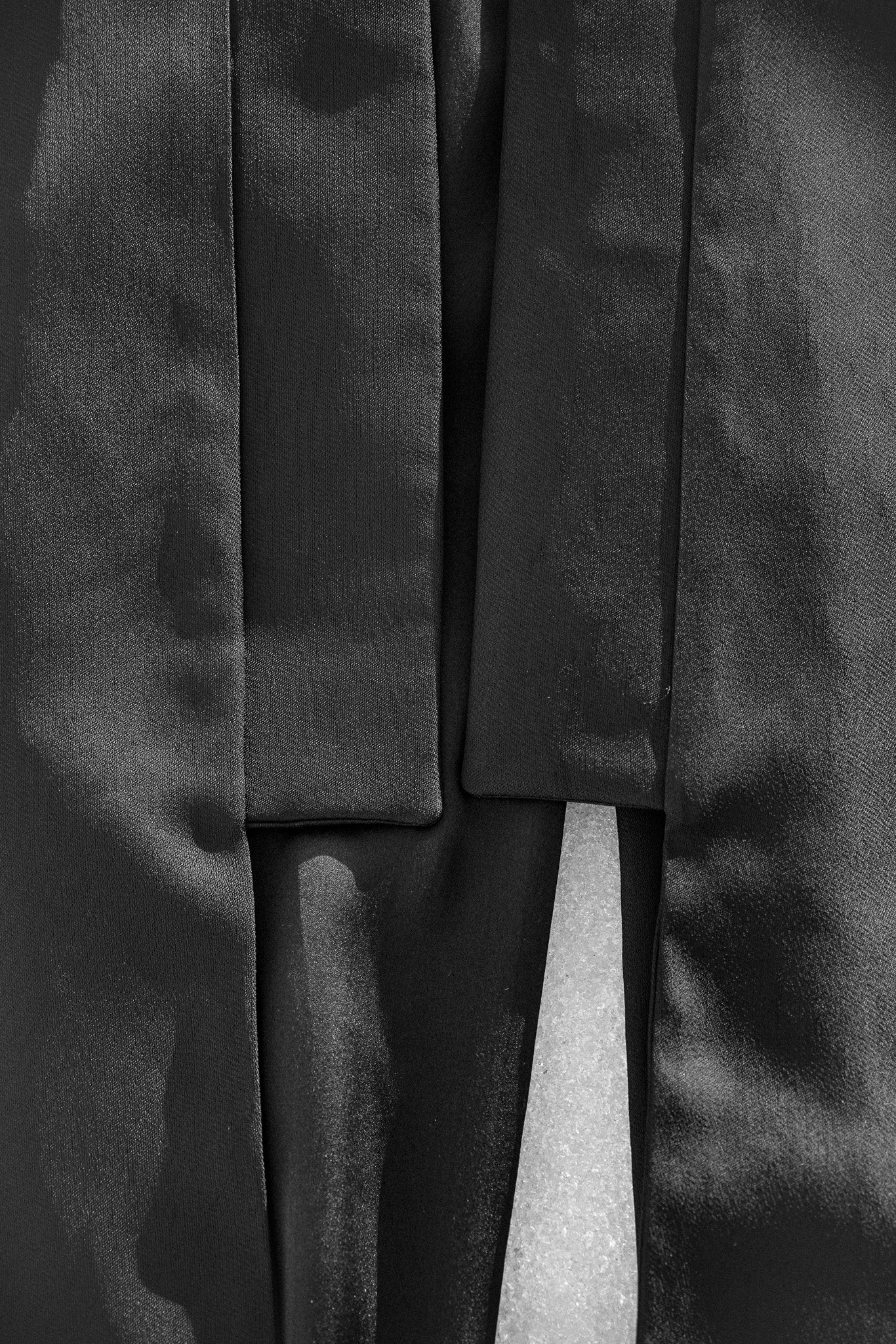 La silhouette se compose d'un kimono ceinturé, en crêpe de viscose doublé de soie, construit avec des manches tailleur. Une chemise en jacquard de viscose, rappelant les motifs royaux. Un pantalon large du même tissu que le kimono, renforcé par des applications de parachute de nylon. Enfin, un sac en nylon et soie aux détails techniques, se portant comme une demi-armure, vient structurer l'ensemble.